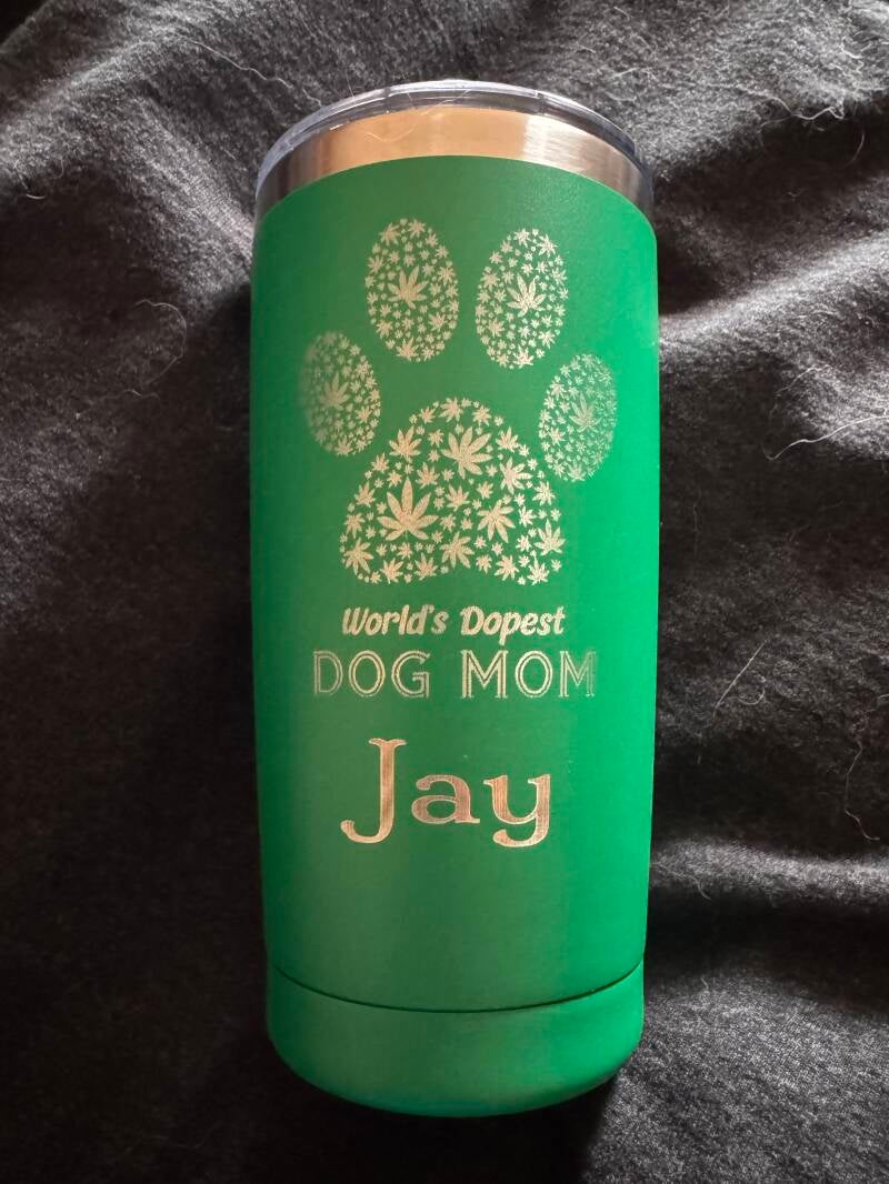 Our nice 20oz. travel mug for the dopest dog mom you know! Can personalize with mom name and up to 5 dog names for an additional $5.00.